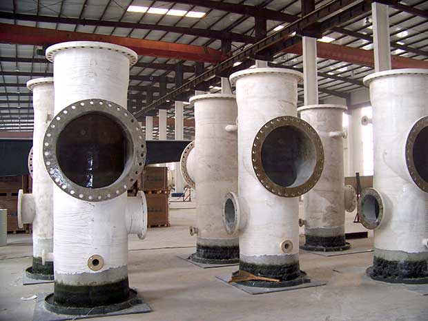 玻璃钢三通采用手糊成型,先制作相应规格的玻璃钢管道,然后将玻璃钢管道组合成一定结构,管与管连接的部分用玻璃钢原材料进行粘接、加强。